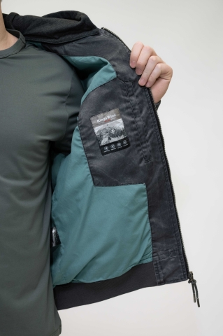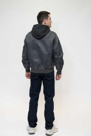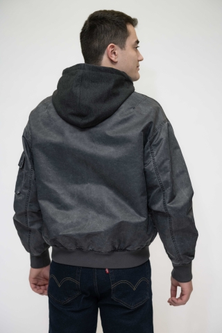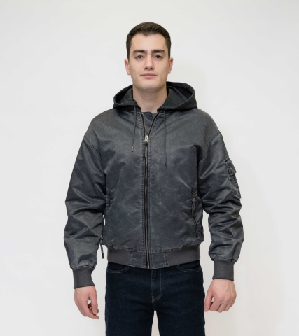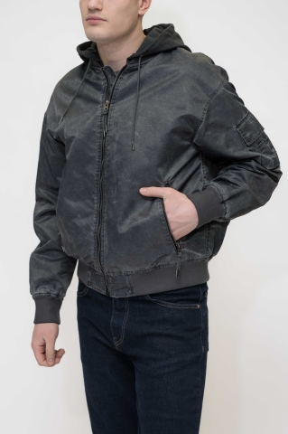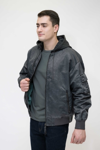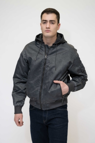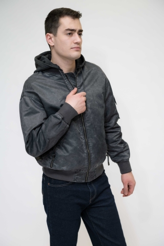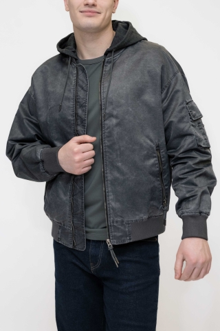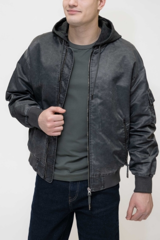 Куртка выполнена в тёмно-синем (графитовом) цвете, с лёгким эффектом потертости.Застёжка на молнию по всей длине. Модель с капюшоном на резинке снизу,что добавляет практичности и защищает от ветра.Имеет:два боковых кармана на молнии;дополнительный карман на рукаве.